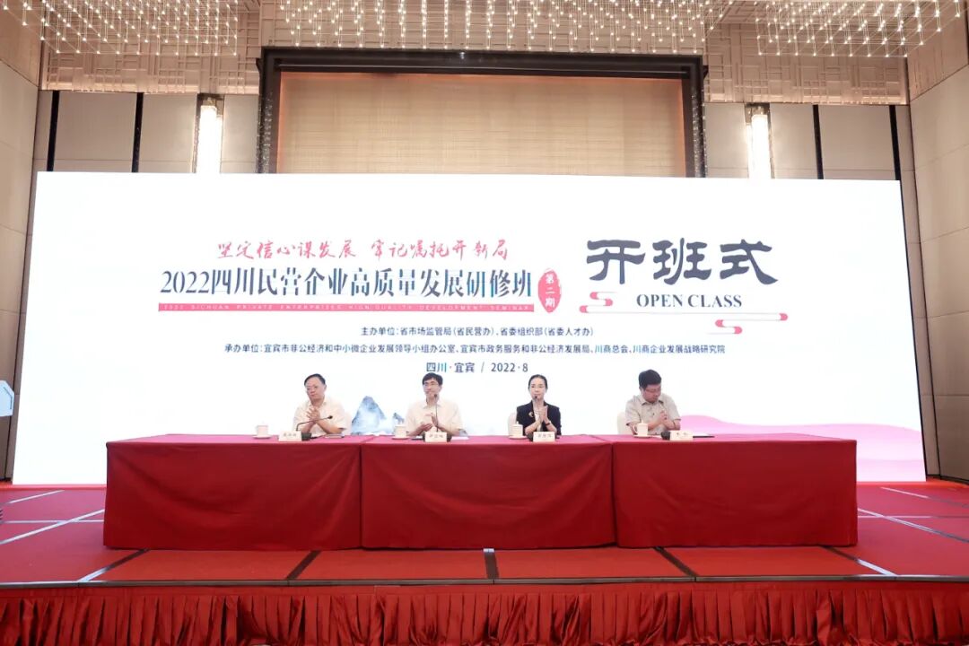 8月29日,由省市场监管局(省民营办)、省委组织部(省委人才办)主办,宜宾市非公经济和中小微企业发展领导小组办公室、宜宾市政务服务和非公经济发展局、川商总会、川商企业发展战略研究院承办的“2022四川民营企业高质量发展研修班”在宜宾开班。