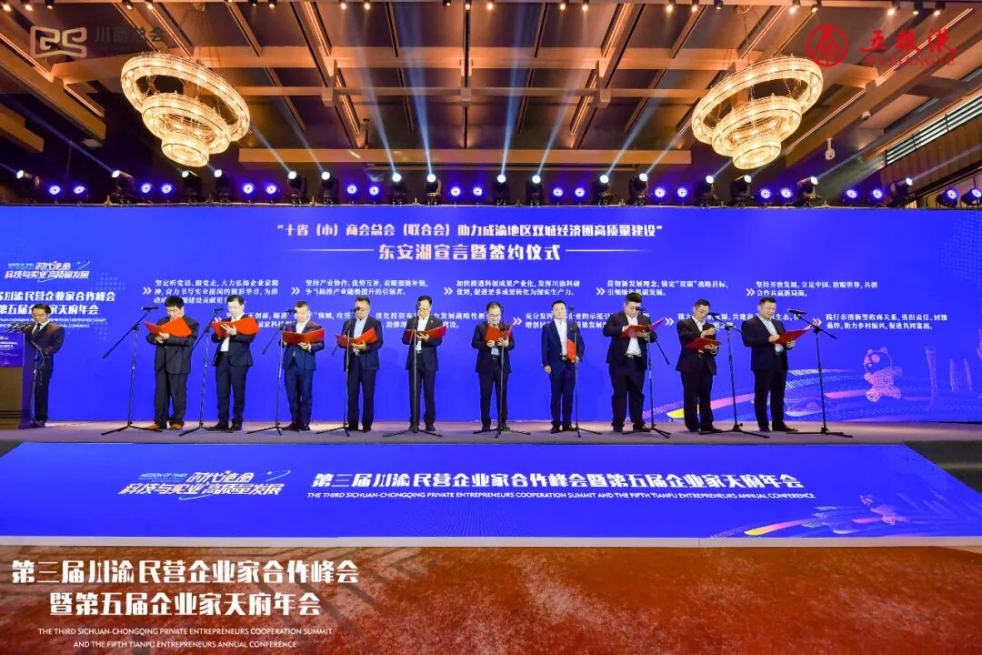 成渝地区双城经济圈建设机遇正吸引着来自全国企业的目光。会上,津商联合会、辽商总会、吉商联合会、龙商总会、湖南异地商会联合会、桂商总会、川商总会、贵商总会、秦商总会、深商总会十省市商会总会(联合会)代表上台,共同宣读“东安湖宣言”,并签署“助力成渝地区双城经济圈高质量建设”的战略框架协议。