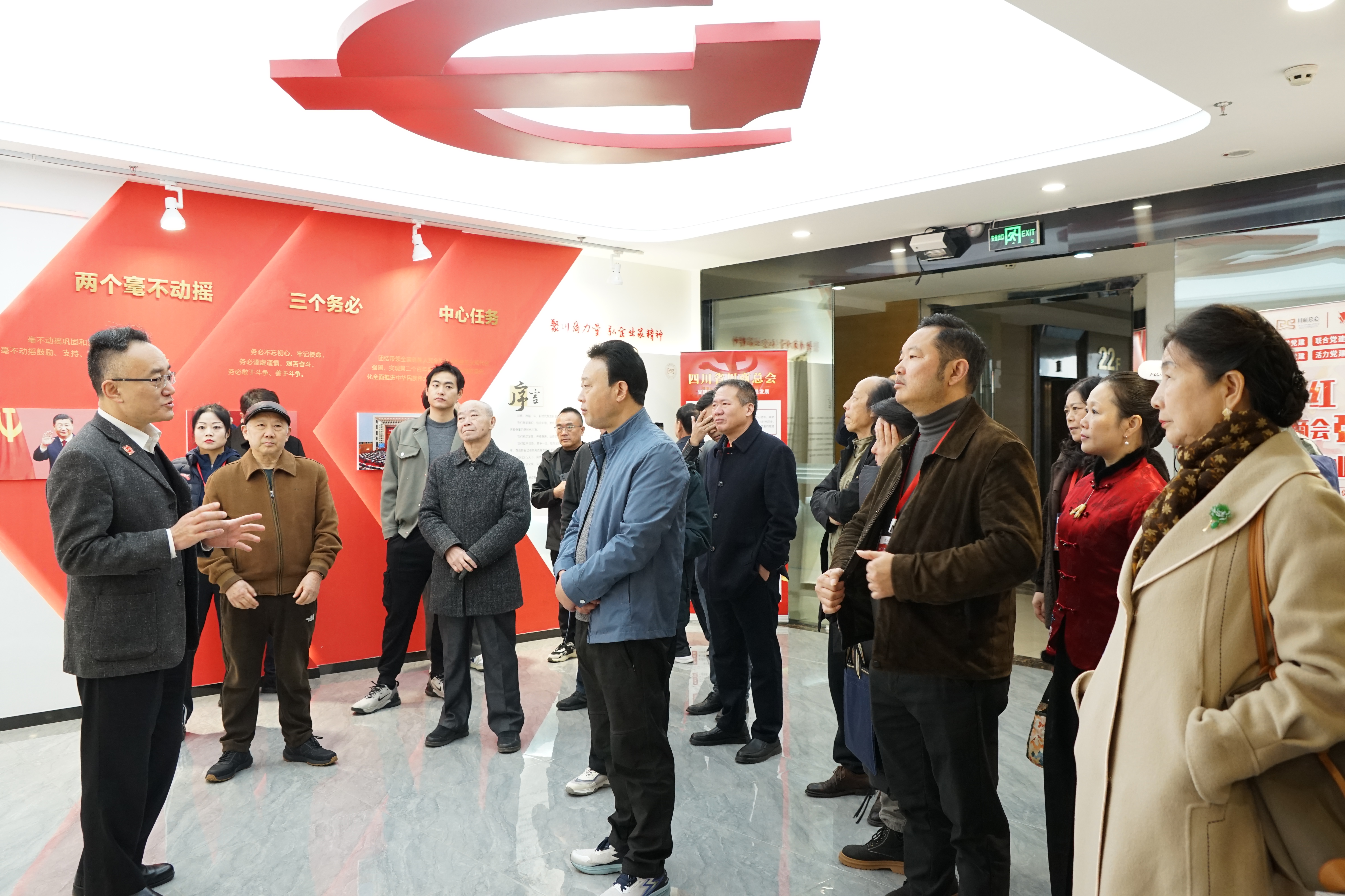川商总会党委办公室主任薛巨实引导来访嘉宾参观党建学习交流阵地,介绍了川商总会建设发展的党建品牌、历程进程、会员架构、服务模式、文化体系等内容。