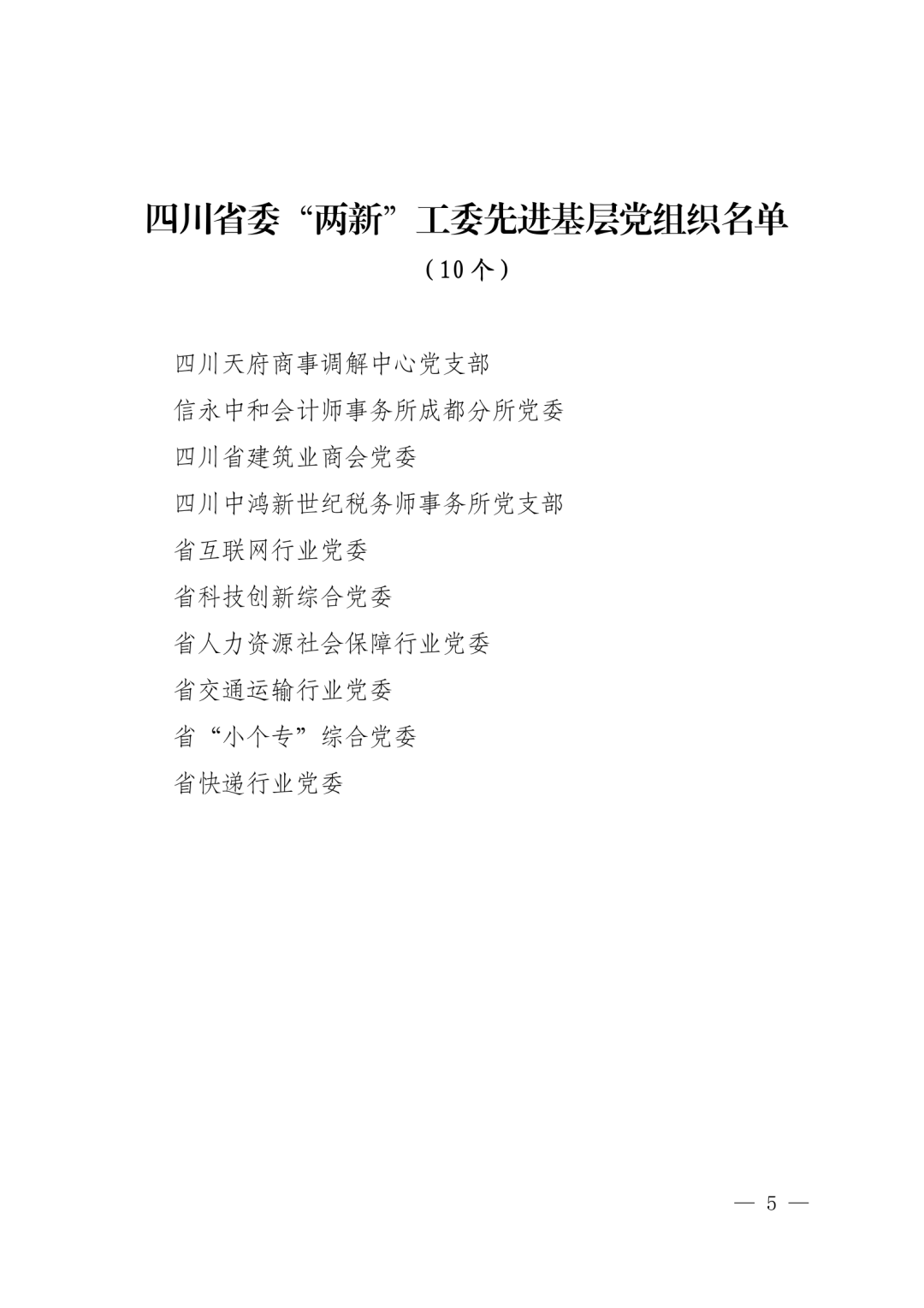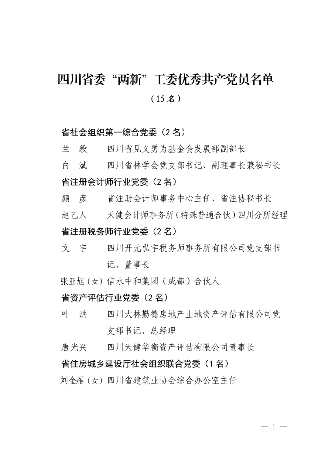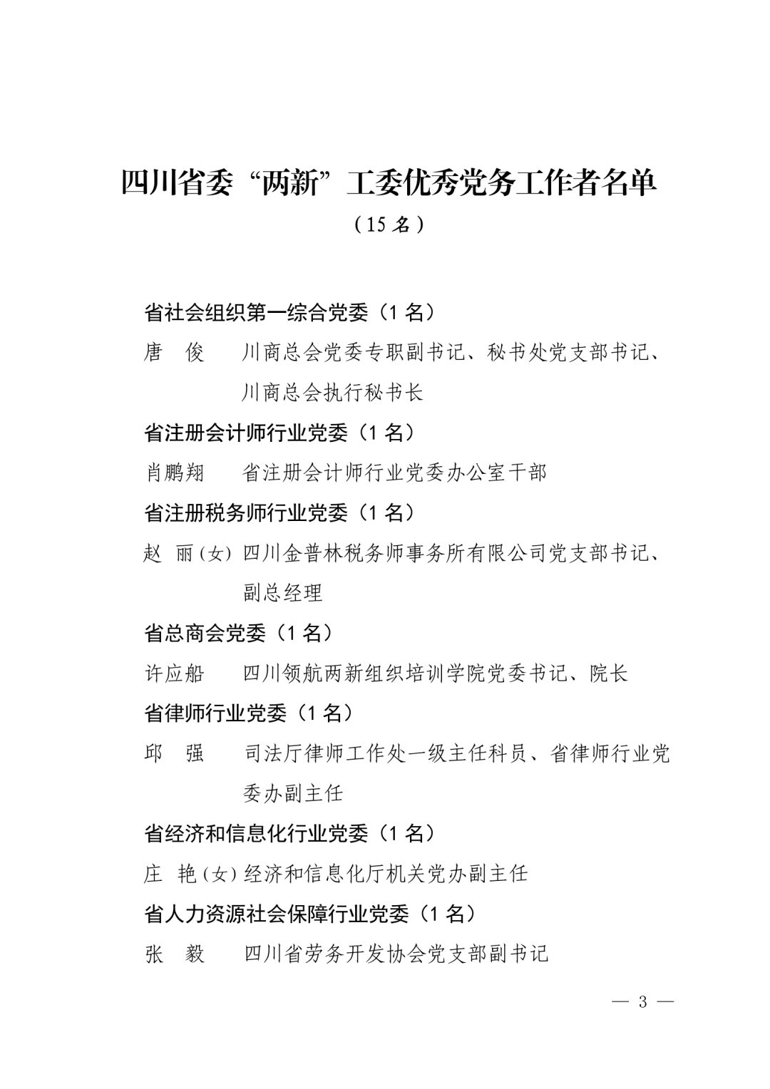 为表彰先进、鼓舞士气,营造崇尚先进、学习先进、争当先进的浓厚氛围,省委“两新”工委决定,授予兰毅等15名同志“优秀共产党员”称号,授予唐俊等15名同志“优秀党务工作者”称号,授予四川天府商事调解中心党支部等10个集体“先进基层党组织”称号。